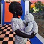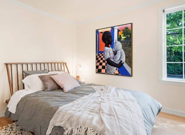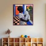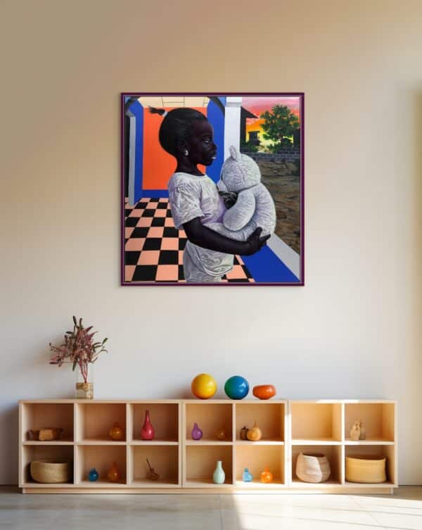 Through the eyes of a child, this painting depicts a mother immersed in deep reflection, nurturing hope for a better future for herself and her loved ones.