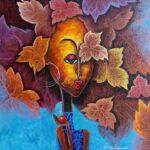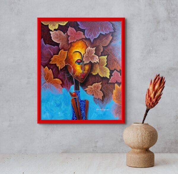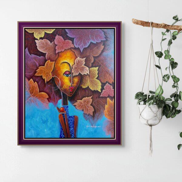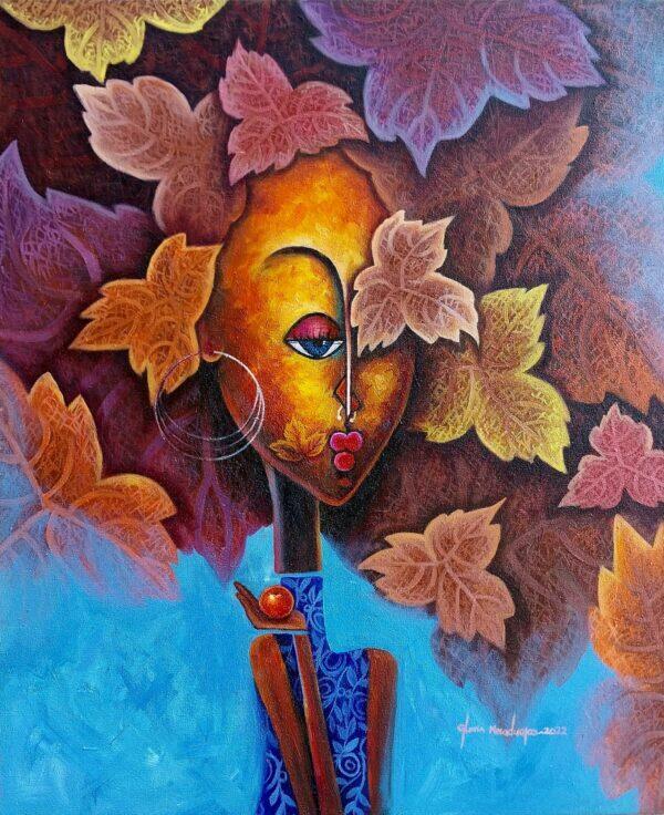 The painting, titled “With an Apple,” depicts a beautiful woman with a wild cascade of leaves for hair. Her skin is a warm, golden brown, and her eyes sparkle with life. She cradles a ripe, red apple in her hand, symbolizing her connection to nature. The apple also represents knowledge, wisdom, good health, and fertility.