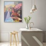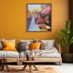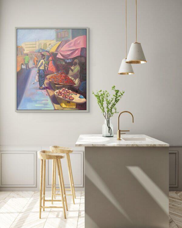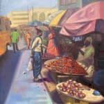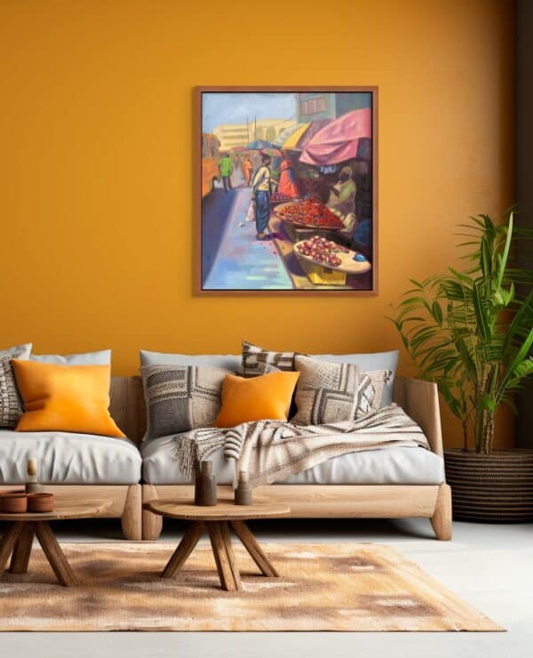 This painting captures the liveliness and beauty of one of the local markets in the city of Lagos, Nigeria. In documenting the essence of the market, the intentional use of a colorful setting to depict the market was employed, and the idea behind it was to show how colorful Africa is, even down to the local or rural areas.